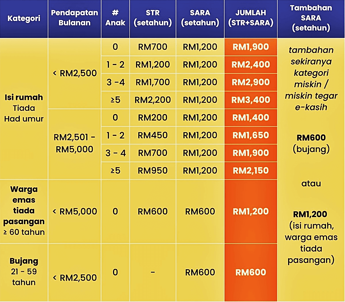 Warga emas yang berumur 60 tahun ke atas dengan status bujang masih menerima bayaran STR tunai sebanyak RM600 setahun, ditambah dengan SARA yang dinaikkan daripada RM450 kepada RM600 setahun – menjadikan jumlah keseluruhan bantuan mereka RM1,200 setahun.